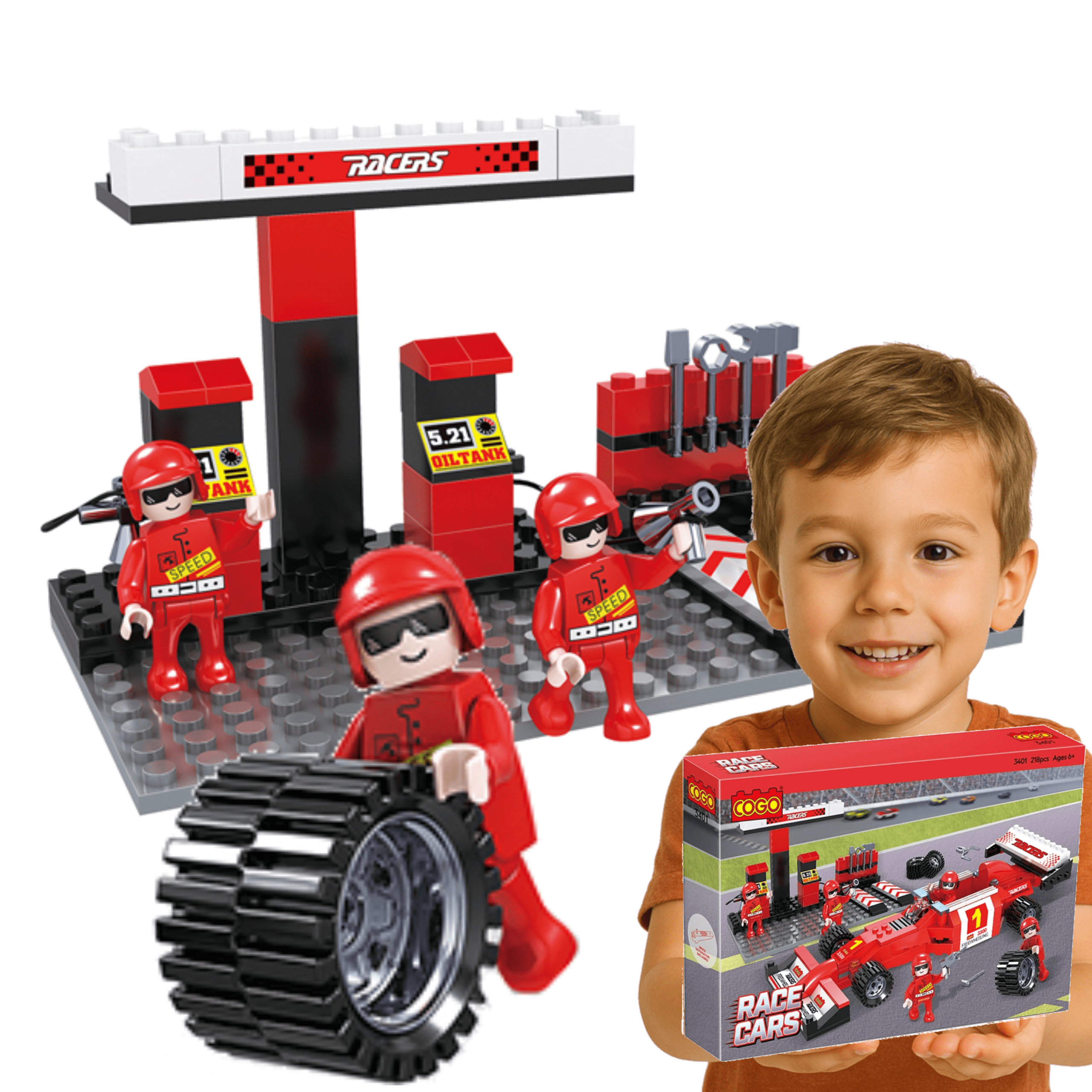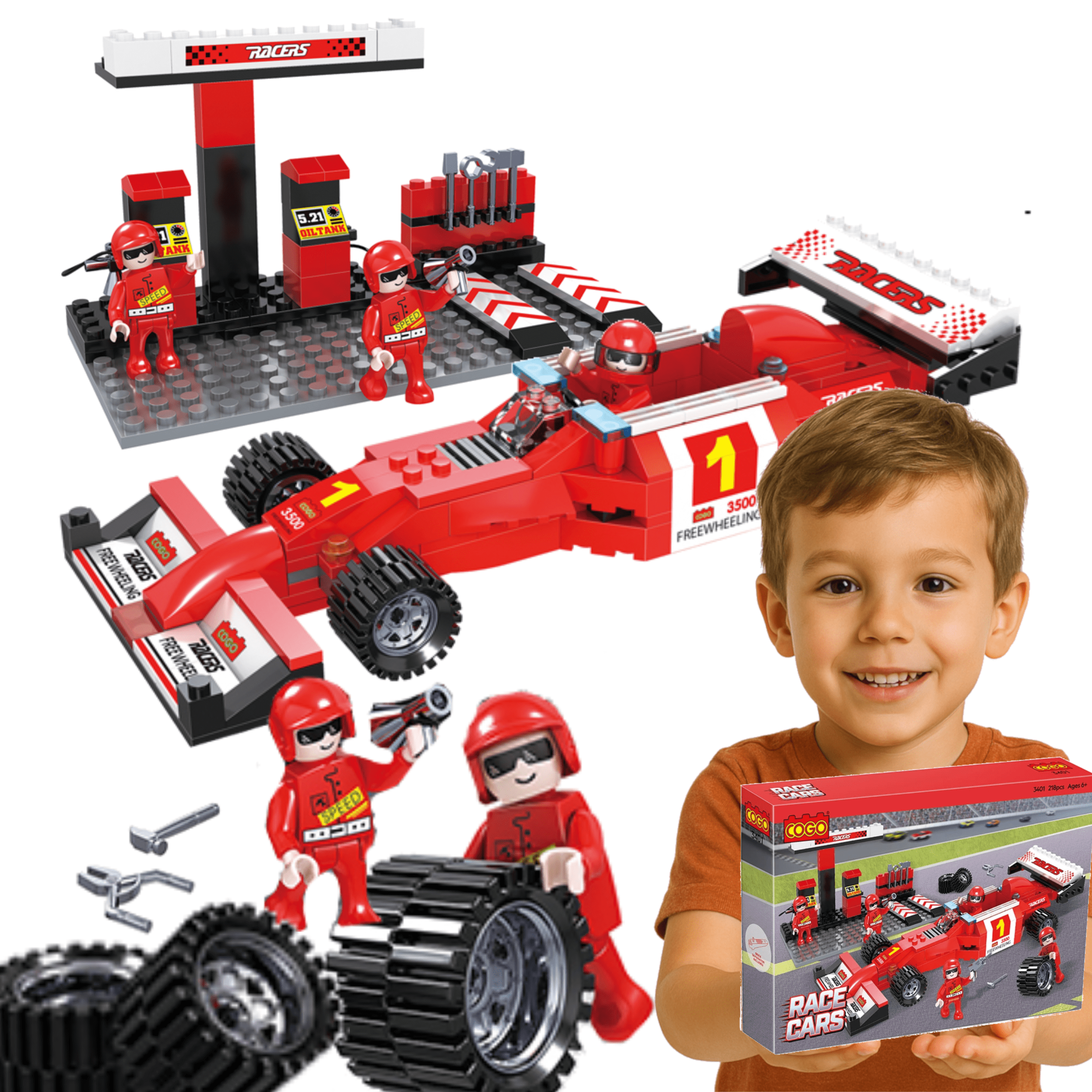 🚗 Klocki konstrukcyjne Formuła 1 – czerwony samochód wyścigowy z pit stopem i figurkami! 218 elementów, instrukcja, realistyczne akcesoria. Dla dzieci 6+, rozwija kreatywność i zdolności manualne. Kompatybilne z LEGO i innymi klockami. Gratis: opaska wyścigowa! 🏁