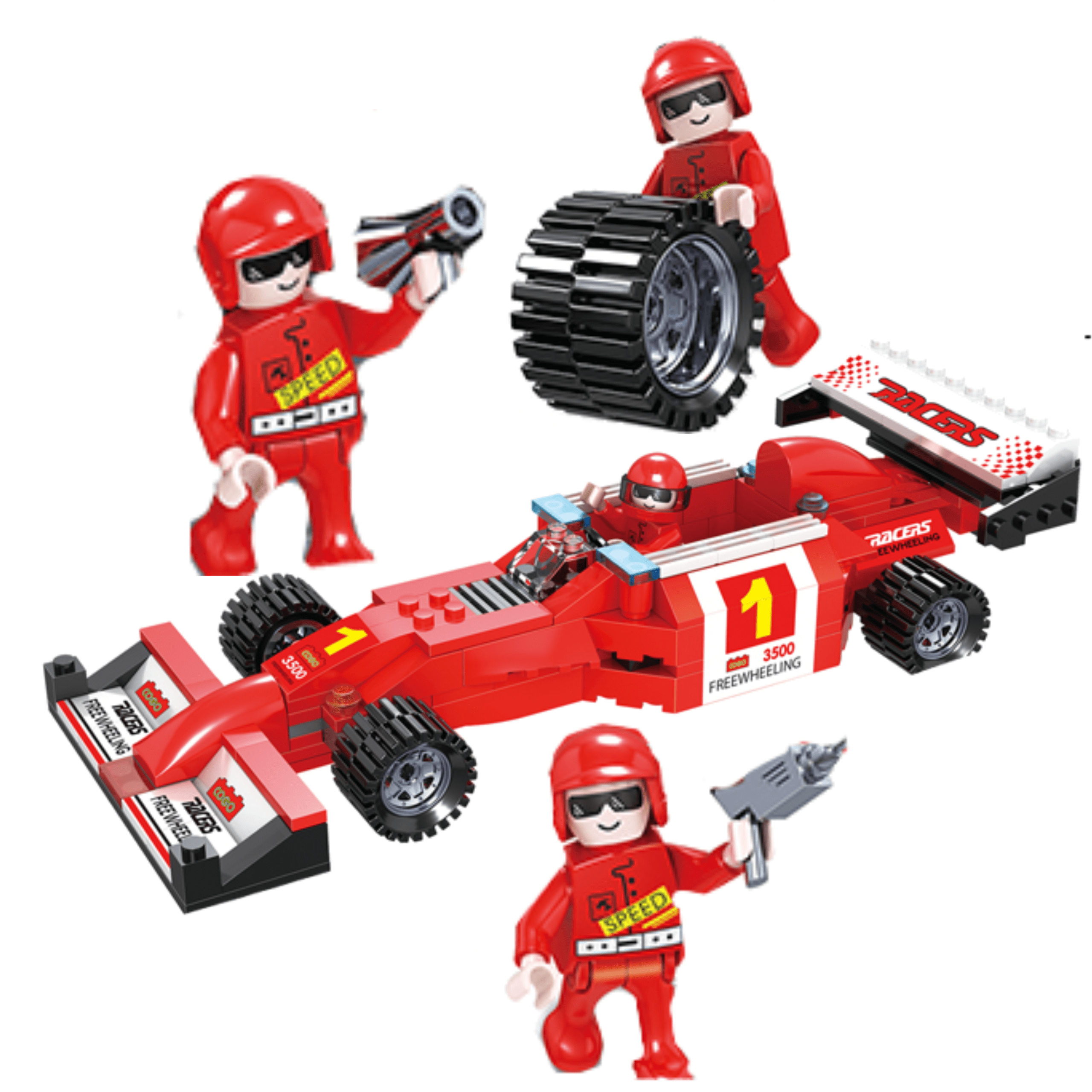 🏎️ Klocki Formuła 1 – Czerwony Samochód Wyścigowy z Pit Stopem i Figurkami